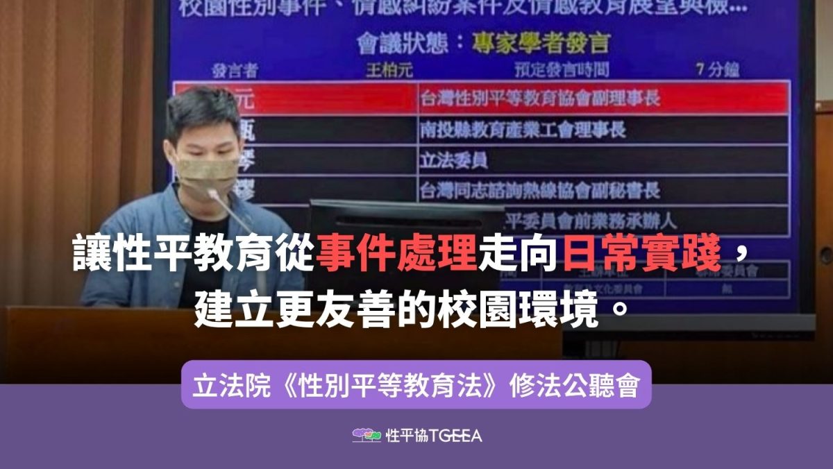 王柏元老師:讓性平教育從事件處理走向日常實踐,建立更友善的校園環境|立法院《性別平等教育法》修法公聽會