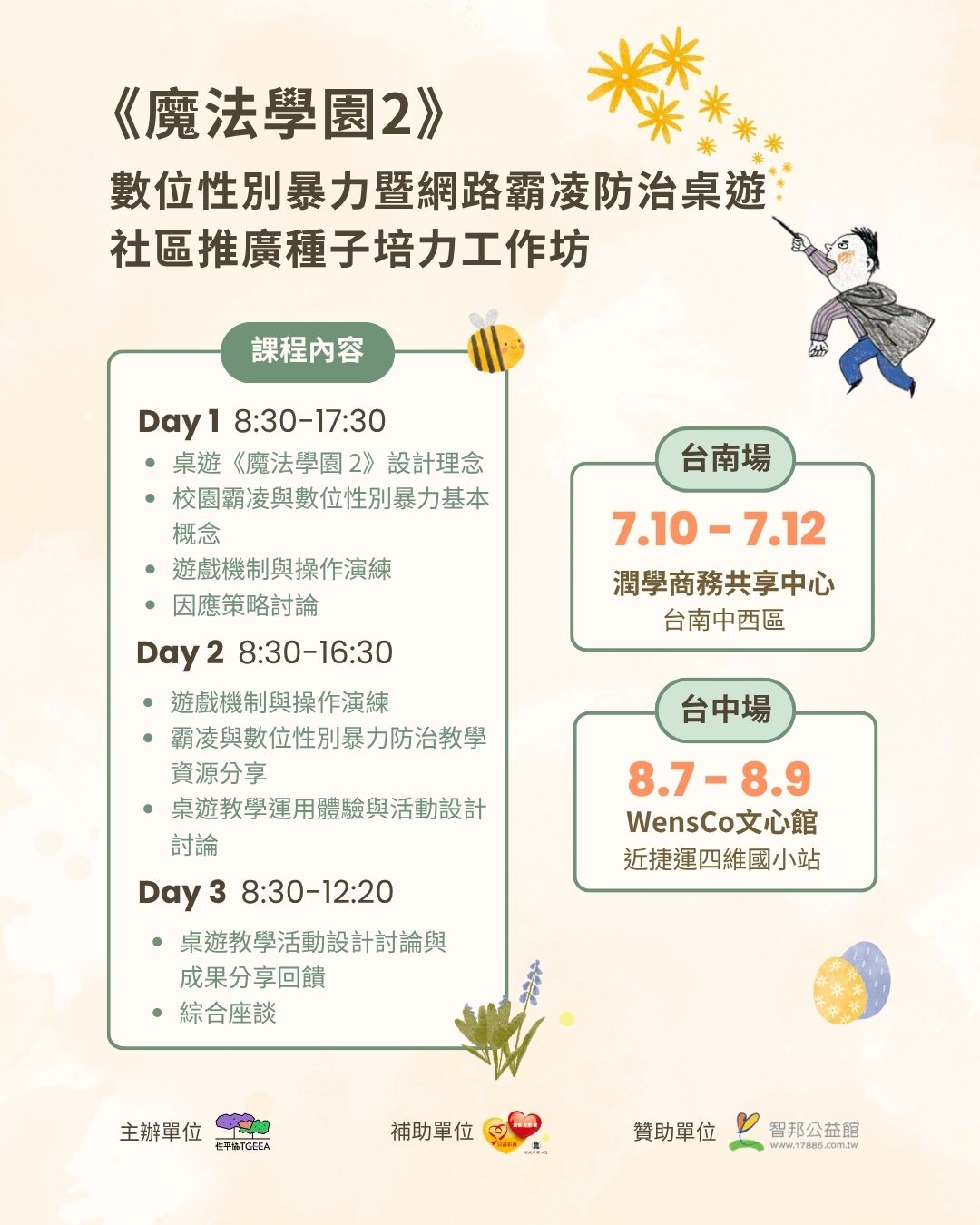 二日半的工作坊課程,將涵蓋數位性別暴力、網路霸凌及兒少性剝削防治教育基礎概念,並讓參訓學員系統性的掌握《魔法學園2》桌遊教材遊戲機制及教學運用方式。