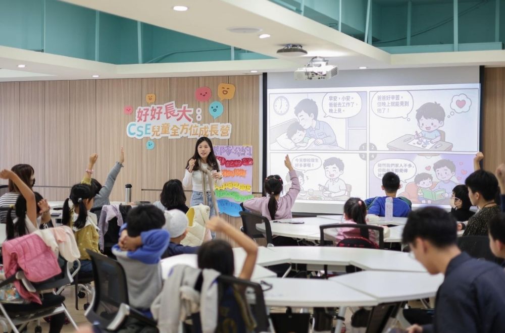 第二屆 CSE 成長營的第一天早上,漢琳老師設計了有趣的活動,引導孩子們認識自己和別人。首先,讓喜歡不同顏色的孩子們組成一組,並在名牌上畫出「外顯的自己」與「不為人知的一面」,以及喜歡、不喜歡的東西,以及擅長、不擅長的事情,結束後,每位孩子都完成了一份精彩的「我的說明書」。