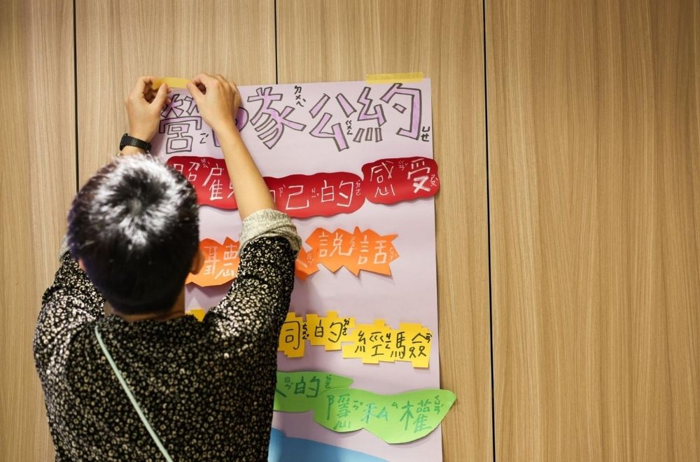 有些孩子立刻說自己最害怕被嘲笑,也有看起來很害羞的孩子,勇敢表示不喜歡別人亂摸自己。在經過一番討論後,孩子們決定把「成為不欺負別人的人」這句話,作為他們共同制定的營隊公約。