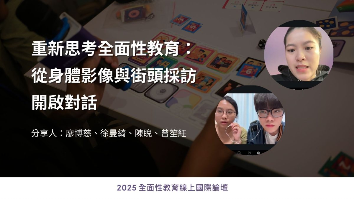 在本次論壇中,新北市「全面・性教育活動設計工作坊」的青年代表廖博慈、徐曼綺,以及陳睨、曾笙紝,也在論壇中分享了他們精彩的活動設計成果。他們分別以「身體部位影像計畫」與「隨機街訪:台灣人的性愉悅認知」為主題,從自己的觀察與創意出發,嘗試推動以愉悅為核心的性教育,讓更多人看見身體與慾望多元而真實的樣貌。